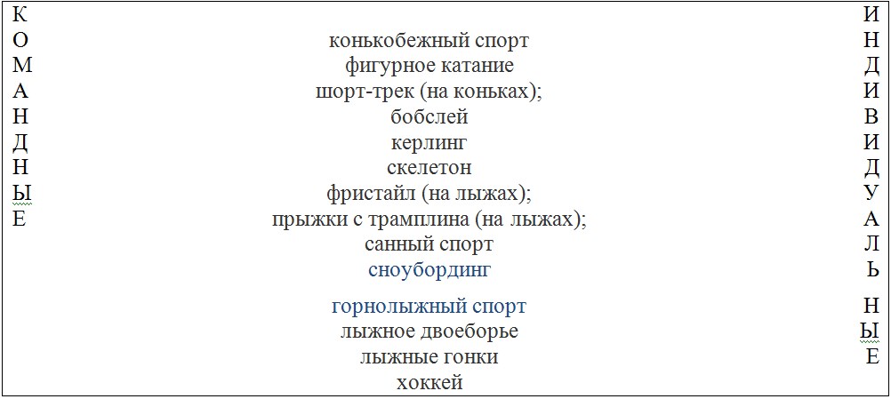 Распредели зимние виды спорта на группы: командные и индивидуальные