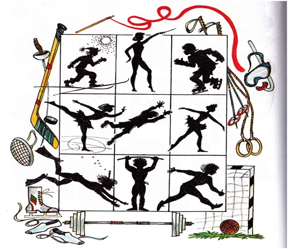 2. Все ли ребята, изображенные силуэтами на рисунке, занимаются спортом? Назови эти виды спорта. Подбери каждому спортивный инвентарь.